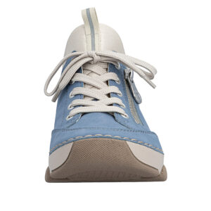 Rieker sneakers til dame i lyseblå. Flotte sneakers i lyseblå med snørebånd, som giver en behagelig og fleksibel pasform. Den dekorative lynlås i siden giver et stilfuldt og moderne touch til designet. Indvendigt har skoen en blød indersål i skind, der gør den komfortabel gennem hele dagen. Ydersålen har stødabsorbering og et godt mønster, som bidrager til god støtte og øget skridsikkerhed.