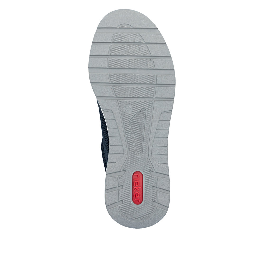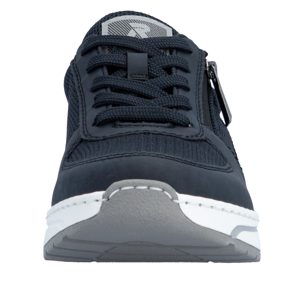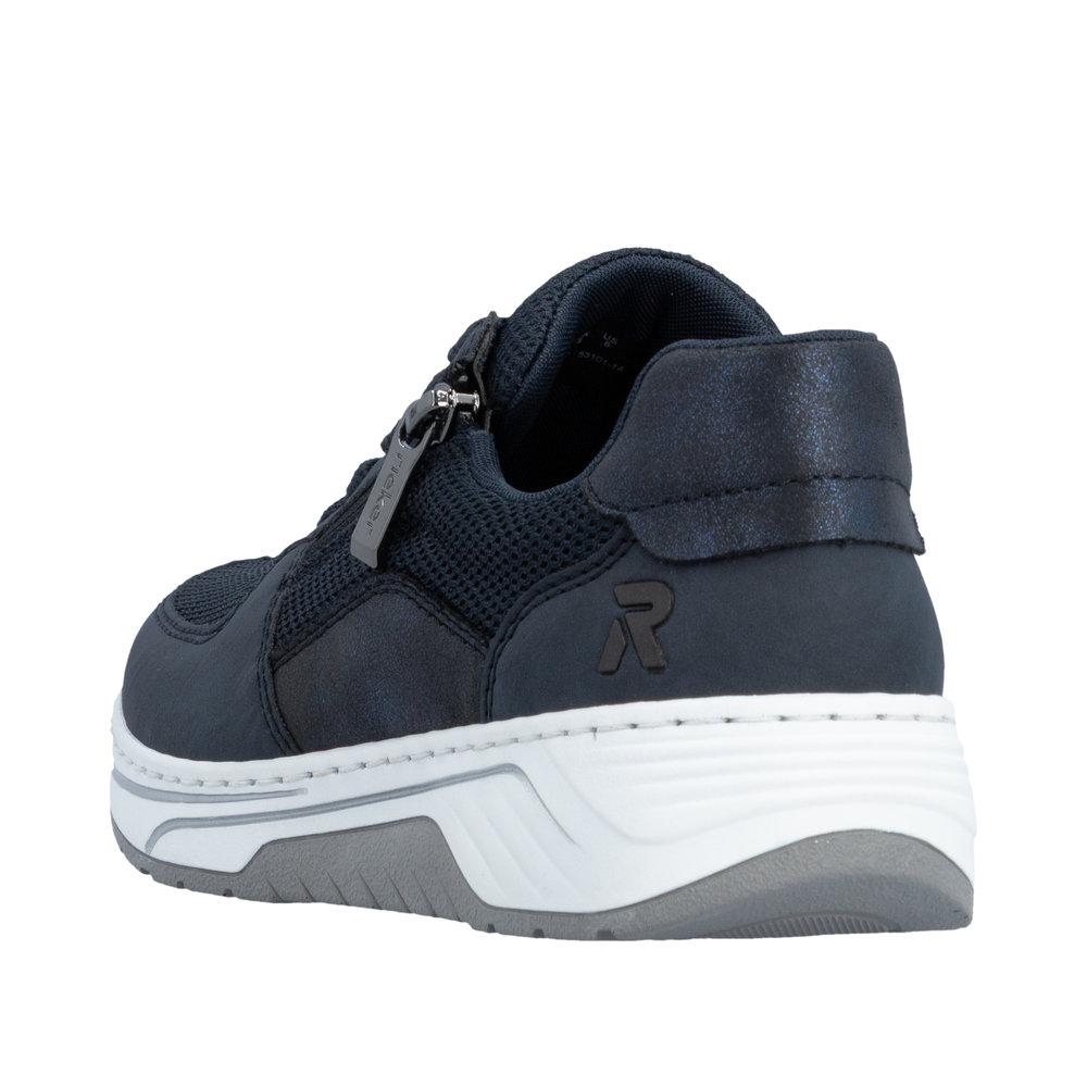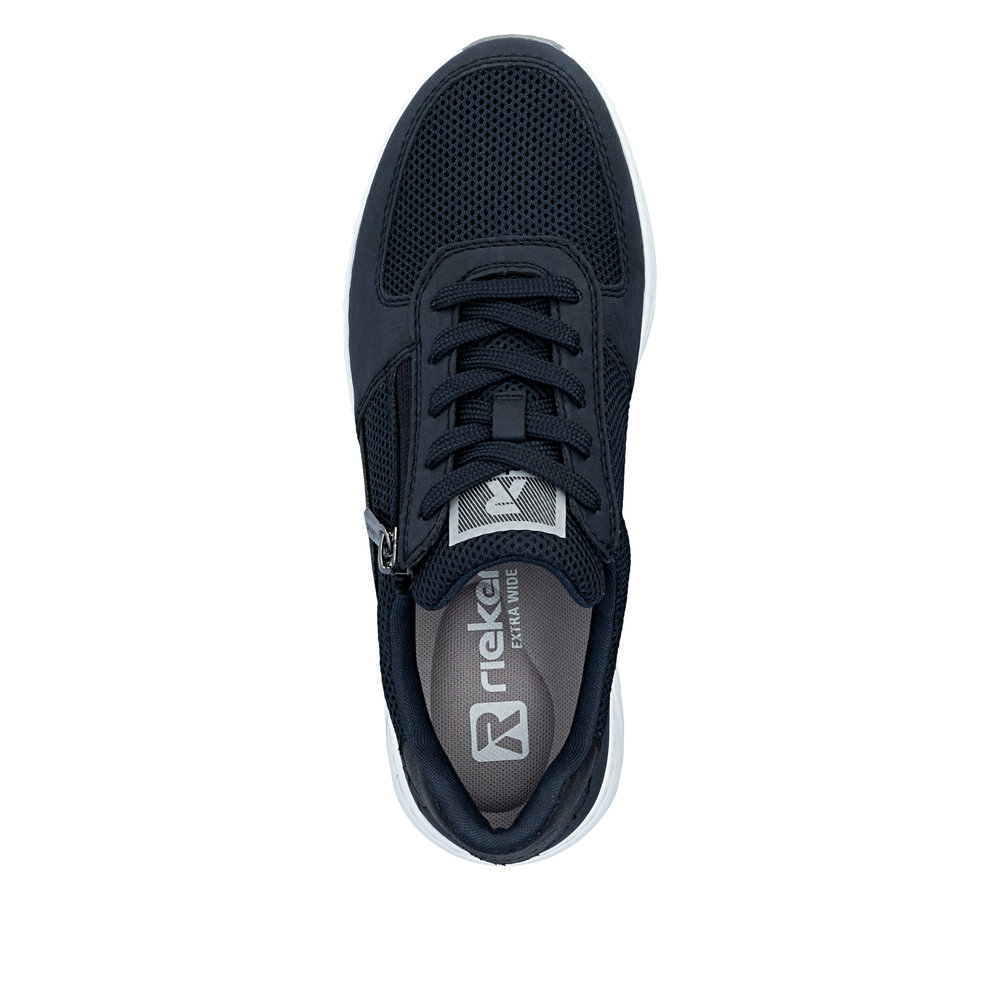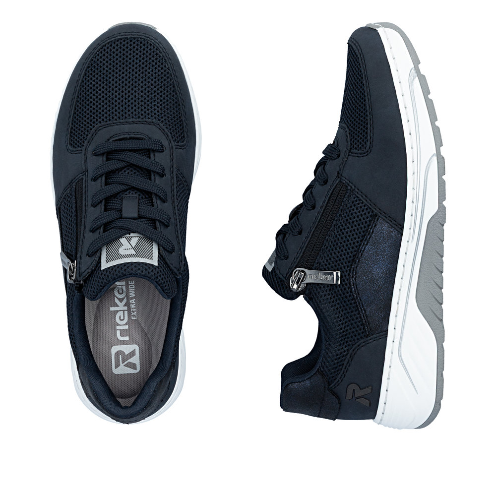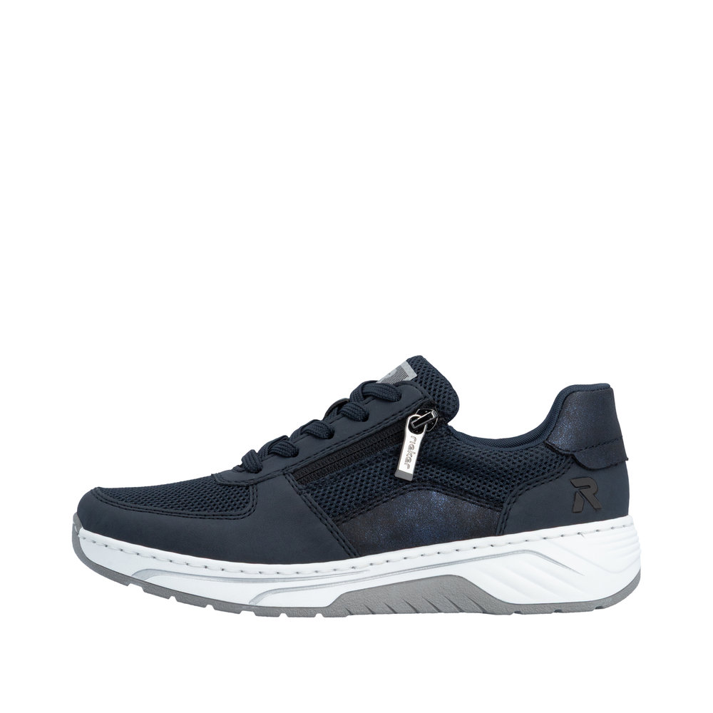 Rieker sneakers til dame i mørkeblå. Stilfulde sneakers der kombinerer et flot udtryk med praktiske løsninger til daglig brug. Kombinationen af snørebånd og funktionel lynlås gør det let både at justere pasformen og komme hurtigt i og af skoen. Skoen er udstyret med en blød og udtagelig sål, og ekstra bredde H som sikrer god rummelighed og komfort hele dagen. Ydersålen har et mønster der giver stødabsorbering og øget skridsikkerhed i hverdagen.
