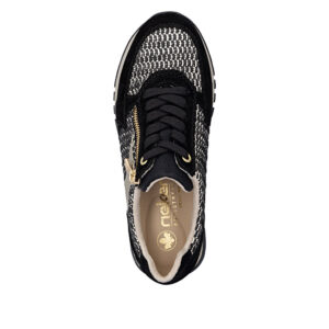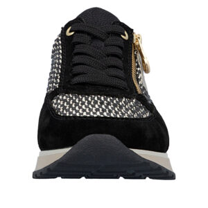 Rieker sneakers til dame i sort. Smart sneakers i sort ruskind med moderne detaljer og en behagelig pasform. Snørebåndene foran gør det let at tilpasse skoen, og lynlåsen på ydersiden gør påtagningen hurtig og nem. Indvendigt har skoen en blød, udtagelig skindsål med ekstra bredde H, der giver god plads og komfort hele dagen. Den stødabsorberende ydersål med mønster sørger for støtte og øget skridsikkerhed i hvert skridt.