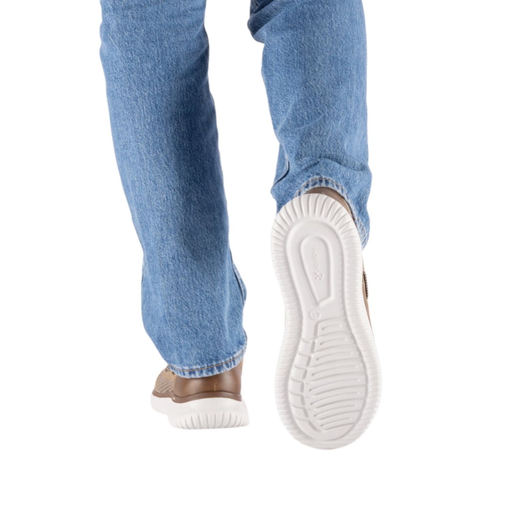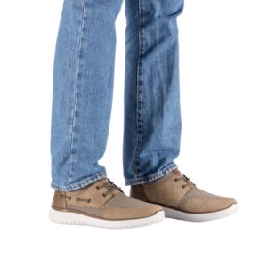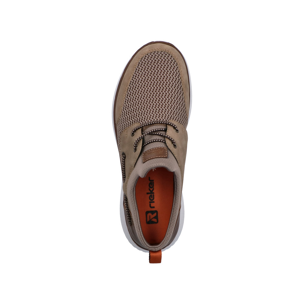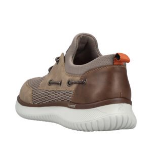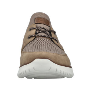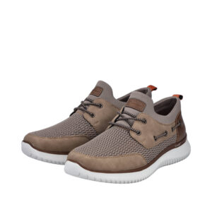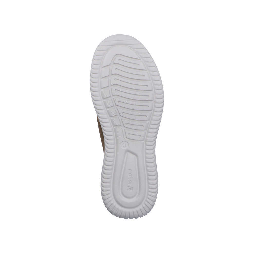 Rieker sneakers til herre i beige. Moderne herre sneakers i beige med overdel i åndbart materiale, som giver en let og behagelig fornemmelse. Elastikken foran gør det hurtigt at komme i skoen og sikrer en fleksibel pasform. Indvendigt finder du en blød indersål med ekstra bredde G, der giver god plads og komfort. Lightsole+ ydersålen gør skoen let og fleksibel, og de stødabsorberende egenskaber giver komfort hele dagen.