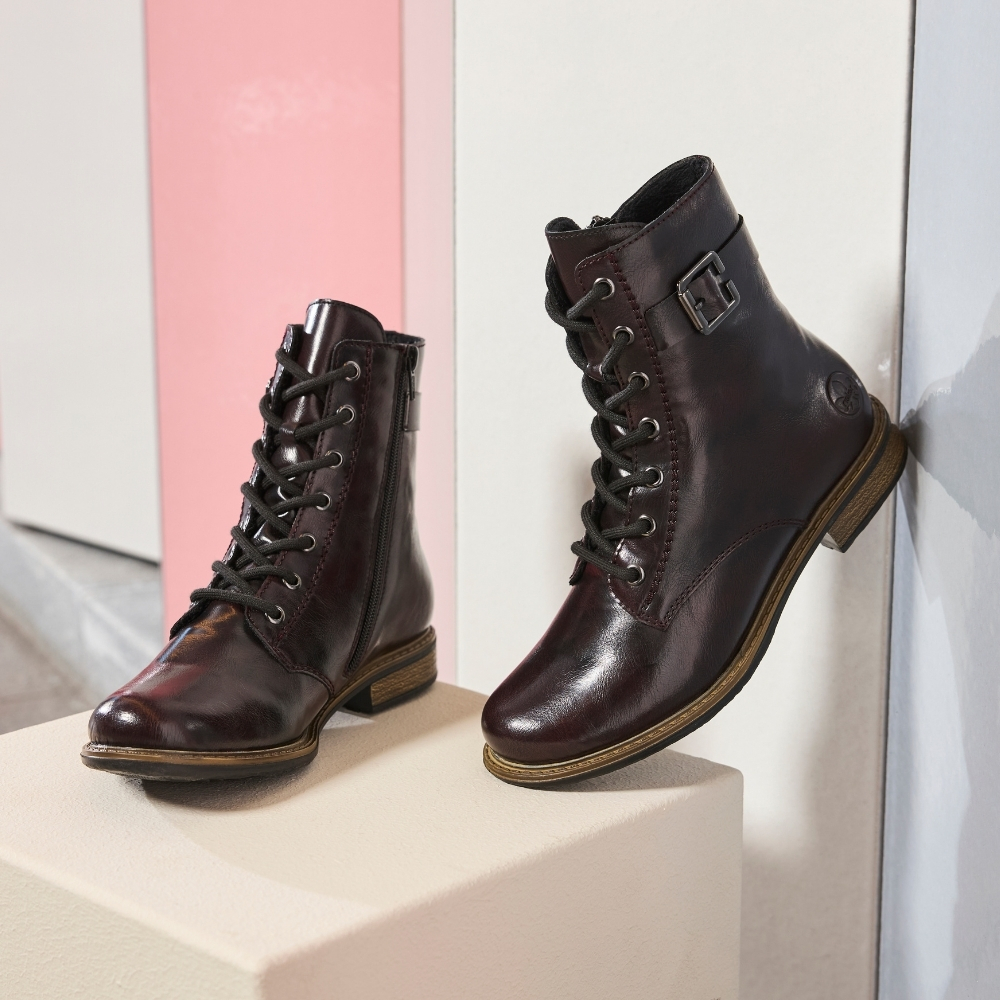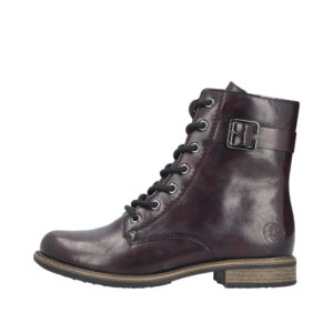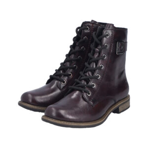 Rieker støvle til dame i bordeaux. Denne støvle i bordeaux kombinerer et moderne design med høj komfort. Den elegante spænde på siden giver et feminint touch, mens snørebånd og lynlås gør det nemt at tilpasse pasformen. Indvendigt sørger den varme foring og den bløde udtagelige sål for behagelig komfort, og med ekstra bredde (H) får foden mere plads og fleksibilitet. Den mønstrede ydersål giver øget stødabsorbering og skridsikkerhed.