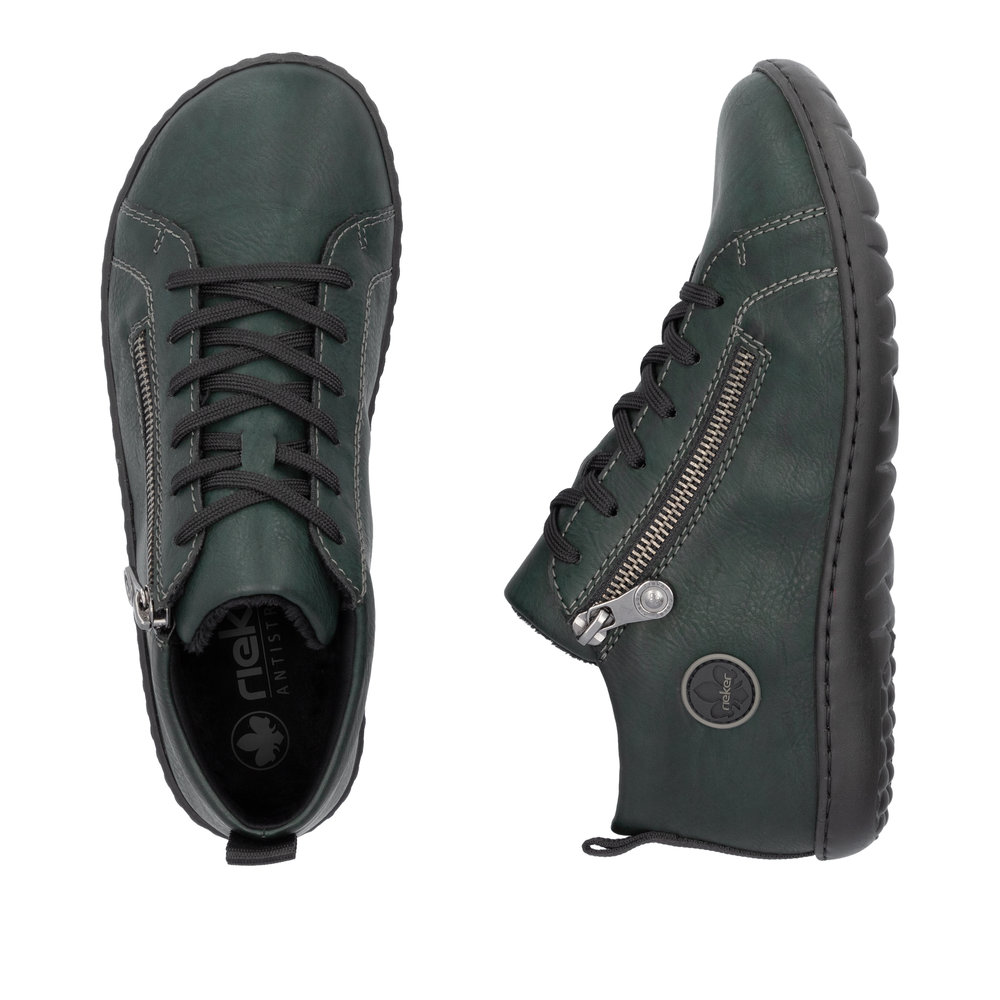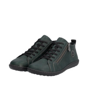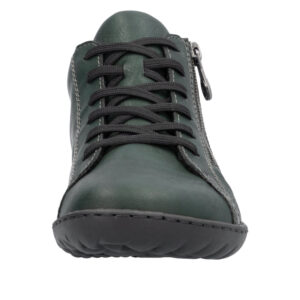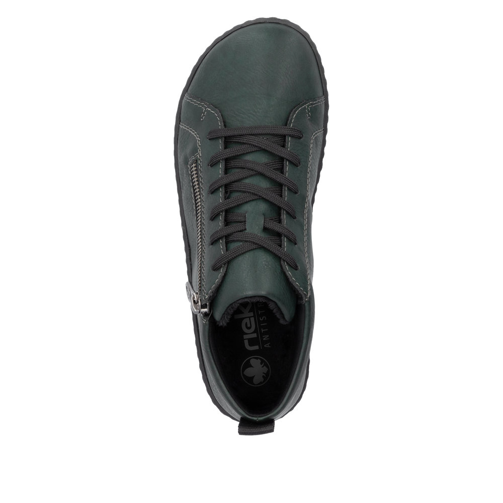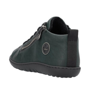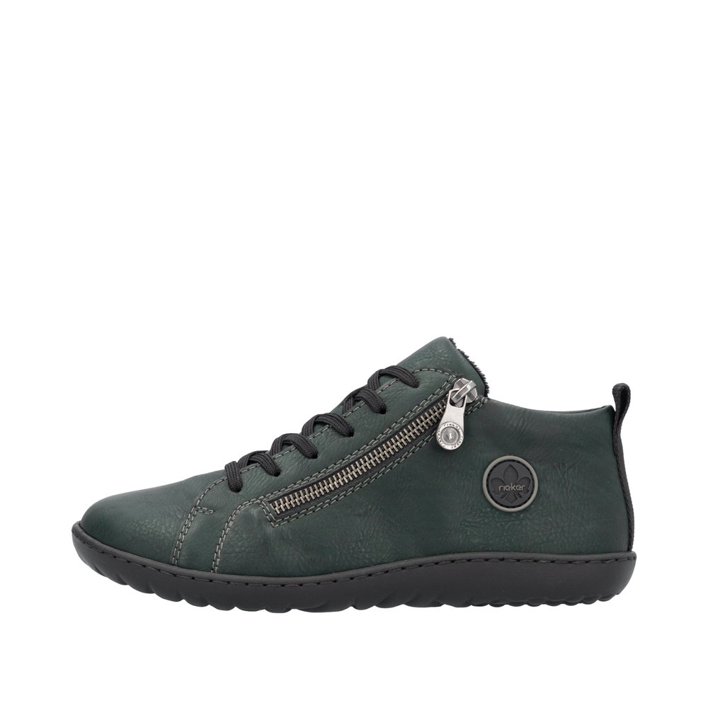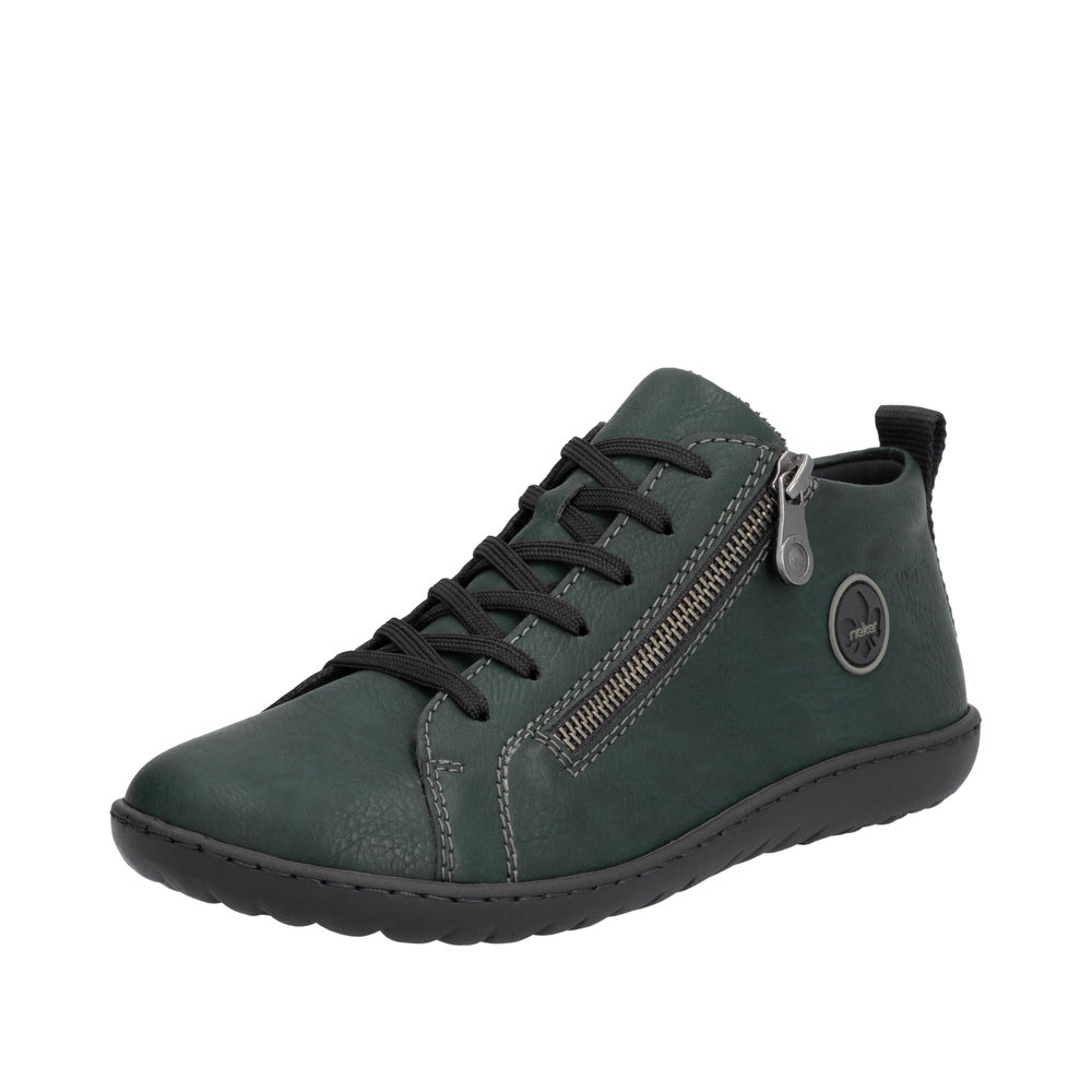 Rieker støvle til dame i grøn. Moderne kort støvle i en smuk grøn farve med fine detaljer og et stilrent design. Støvlen har snørebånd foran for en justerbar pasform samt en lynlås på ydersiden, der gør den nem at tage af og på. Indvendigt sørger en blød indersål og let foring for varme og komfort. Den fleksible ydersål med stødabsorberende egenskaber og mønster giver både stabilitet og øget skridsikkerhed gennem dagen.