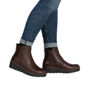 Rieker støvle til dame i mørkebrun. Denne elegante støvle i skind kombinerer et klassisk design med behagelig komfort. Den funktionelle lynlås gør støvlen let at bruge og praktisk i hverdagen. Indvendigt finder du en varm foring og en blød indersål, som giver en behagelig fornemmelse dagen igennem. Ydersålen har et chunky udtryk og måler 4,5 cm, og det mønstrede design giver øget støtte og skridsikkerhed.