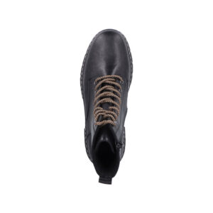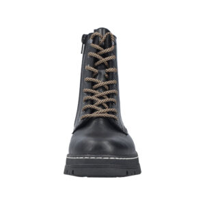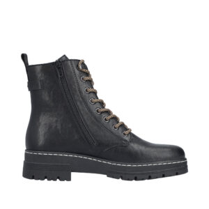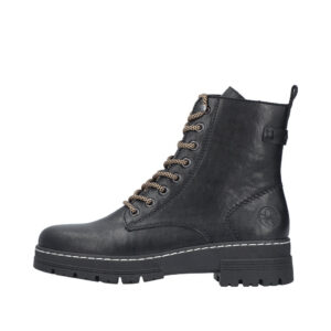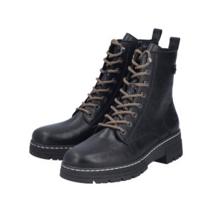 Rieker støvle til dame i sort. En stilfuld og praktisk sort støvle, der passer perfekt til daglig brug. Støvlen har snørebånd og en funktionel lynlås der gør støvlen let at justere, så den sidder godt på foden. Indvendigt er støvlen udstyret med en blød udtagelig sål og en let foring, som giver god komfort gennem hele dagen. Den kraftige ydersål har en blokhæl på 2 cm og et mønster, der giver øget stødabsorbering og skridsikkerhed.