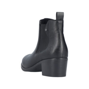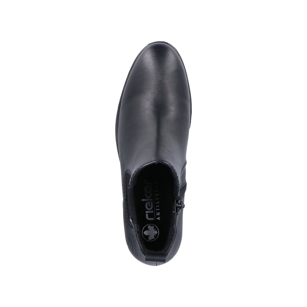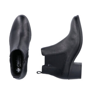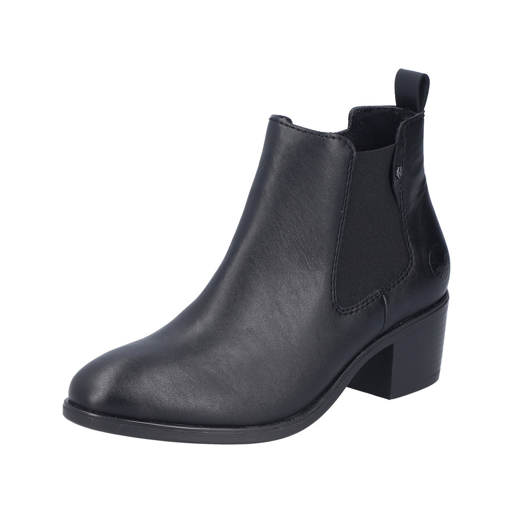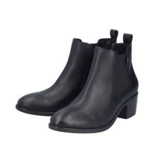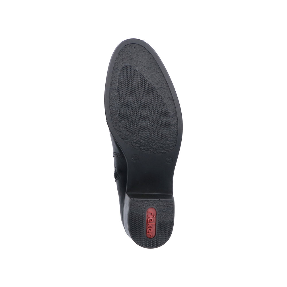 Rieker støvle til dame i sort. Denne klassiske støvle er et oplagt valg til finere brug. Modellen er udstyret med en funktionel lynlås på indersiden og en elastik på ydersiden, som gør det nemt at tage støvlen af og på. Indvendigt finder du en blød sål og en let foring, der giver god komfort dagen igennem. Blokhæl på 5 cm tilføjer et flot og feminint løft, mens den mønstrede ydersål øger stødabsorbering og skridsikkerhed.