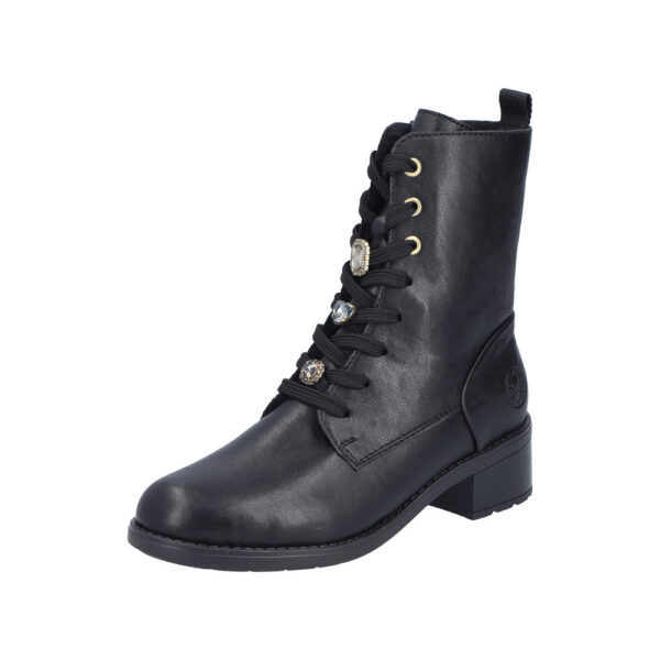 Rieker støvle til dame i sort. Elegant støvle med flotte detaljer på snørebåndet, som giver et stilfuldt og feminint look. Støvlen har både snørebånd og en praktisk lynlås, hvilket gør støvlen nem at tage på og giver en behagelig pasform. Indvendigt finder du en blød udtagelig sål og en varm foring, der sikrer komfort dagen igennem. Den 4,5 cm høje blokhæl giver et elegant touch, og den mønstrede ydersål giver øget stødabsorbering og skridsikkerhed.