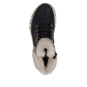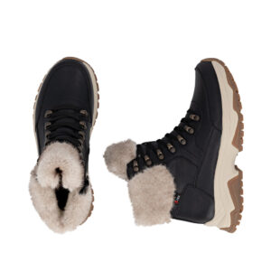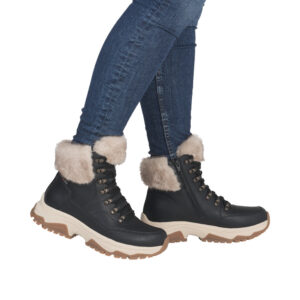 Rieker støvle til dame i sort. Stilfuld og funktionel støvle med en skindoverdel, perfekt til hverdagen. Snørebåndene foran giver mulighed for at tilpasse pasformen, mens den praktiske lynlås gør det let at komme i og af støvlen. Indvendigt er den udstyret med en varm foring og en blød udtagelig sål, som giver behagelig komfort dagen igennem. Rieker-Tex gør støvlen kraftig vandafvisende, og ydersålen med mønster giver øget stødabsorbering og skridsikkerhed