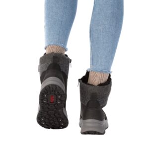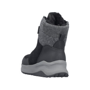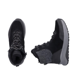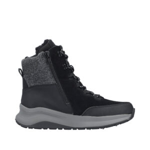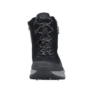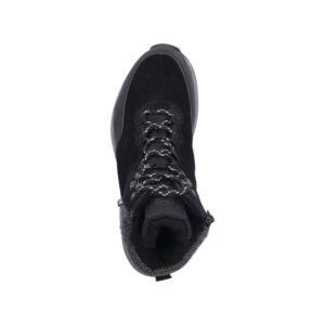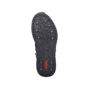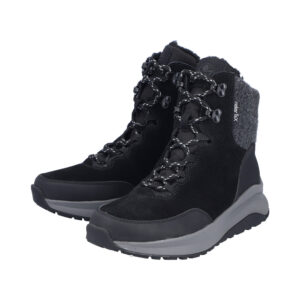Rieker støvle til dame i sort. Flot sort vinterstøvle med moderne detaljer og et behageligt design. Snørebåndene foran giver en justerbar pasform, og lynlåsen på indersiden gør støvlen nem at tage af og på. Indvendigt finder du en varm foring og en blød, udtagelig indersål, der giver god komfort gennem dagen. Støvlen har Rieker-Tex for kraftig vandafvisning, mens ydersålen med metalpigge øger skridsikkerheden på glatte overflader. Den stødabsorberende sål giver ekstra støtte og gør støvlen komfortabel at bruge hele dagen.