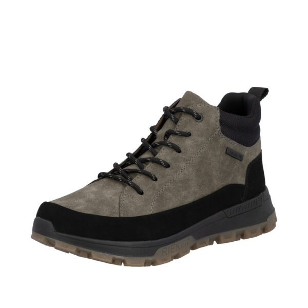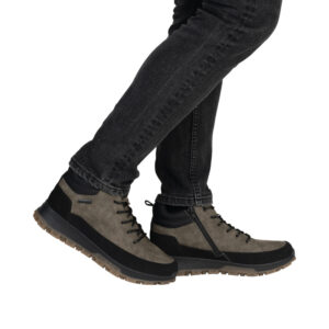 Rieker støvle til herre i brun. En moderne herrestøvle i brun med flotte sorte detaljer, der giver et stilfuldt look. Støvlen har snørebånd foran, som giver en justerbar pasformen, og en praktisk lynlås på indersiden, der gør det let at komme i og af den. Indvendigt er den udstyret med en blød, udtagelig indersål og en let foring, der holder fødderne lune i de kolde måneder. Med Rieker-Tex får du en støvle, der er kraftigt vandafvisende, og den ekstra bredde G giver en rummelig pasform. Ydersålen er både let og fleksibel med mønster, som giver øget skridsikkerhed og effektiv stødabsorbering.