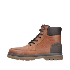 Rieker støvle til herre i brun. Moderne støvle i brunt skind med et klassisk udtryk og høj komfort. Støvlen er designet med snørebånd, og en funktionel lynlås på indersiden, så støvlen er let at tage af og på. Indvendigt sørger en blød udtagelig sål og en let foring for komfort, mens den ekstra bredde (H) giver foden god rummelighed. Den mønstrede ydersål giver øget stødabsorbering og skridsikkerhed.