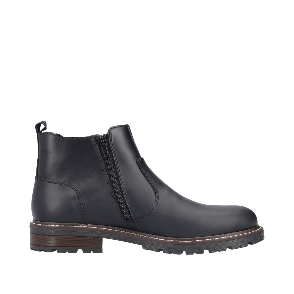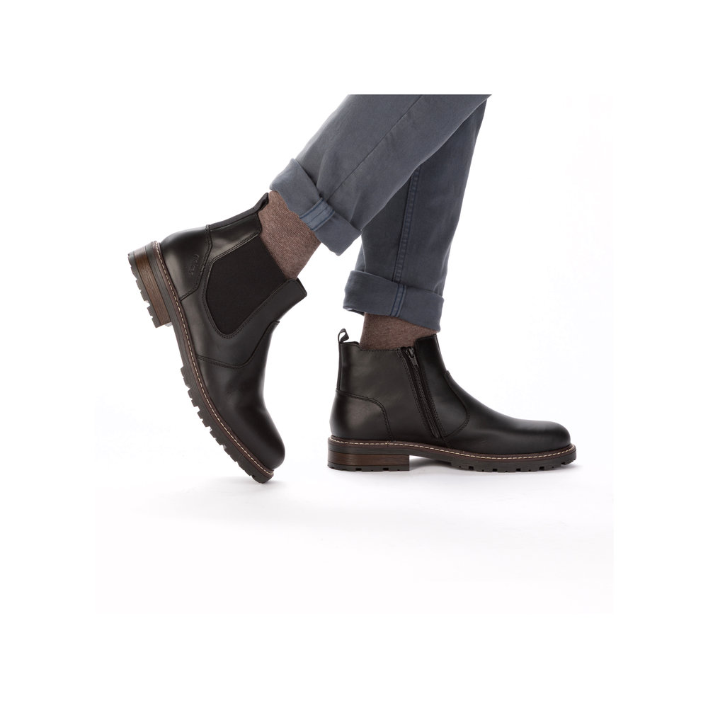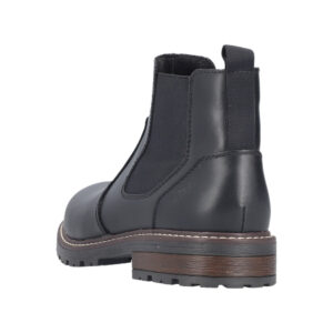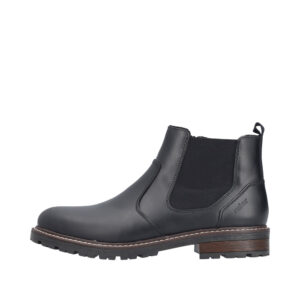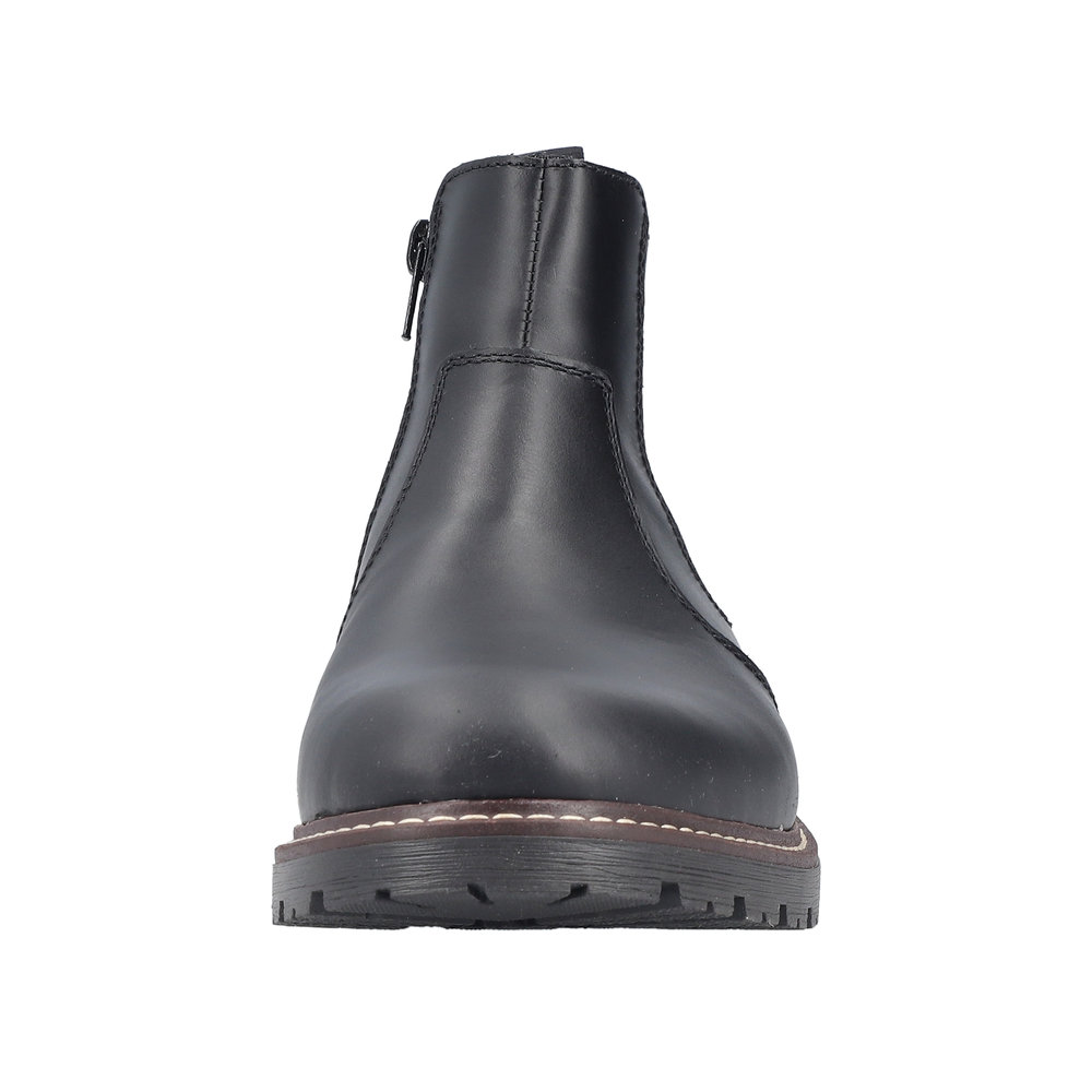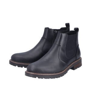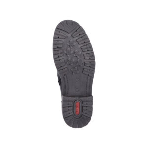 Rieker støvle til herre i sort. Denne smarte skindstøvle er ideel til hverdagen, hvor komfort og funktionalitet er i fokus. Modellen er udstyret med lynlås og elastik, så du let kan tage støvlen af og på. Indvendigt finder du en blød sål og en let foring, som sammen med ekstra bredde (G) giver en rummelig og behagelig pasform. Den mønstrede ydersål giver øget stødabsorbering og skridsikkerhed.