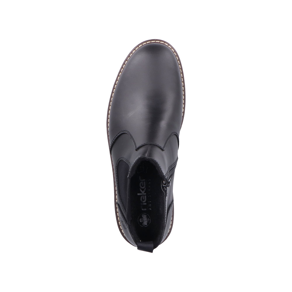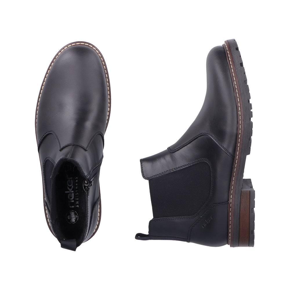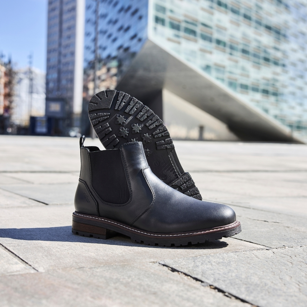 Rieker støvle til herre i sort. Denne smarte skindstøvle er ideel til hverdagen, hvor komfort og funktionalitet er i fokus. Modellen er udstyret med lynlås og elastik, så du let kan tage støvlen af og på. Indvendigt finder du en blød sål og en let foring, som sammen med ekstra bredde (G) giver en rummelig og behagelig pasform. Den mønstrede ydersål giver øget stødabsorbering og skridsikkerhed.