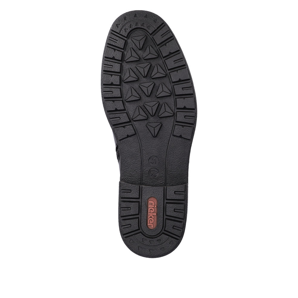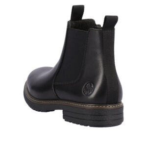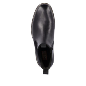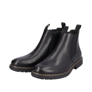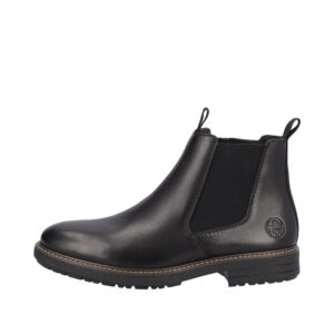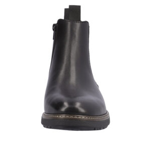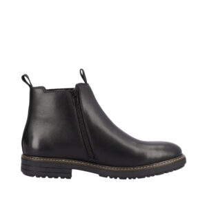 Rieker støvle til herre i sort. Stilren herrestøvle i sort skind, som kombinerer enkelt design med høj komfort. Støvlen er nem at tage på takket være lynlåsen på indersiden, mens elastikken på ydersiden giver en fleksibel pasform. Indvendigt mødes du af en let foring og en blød indersål med ekstra bredde (G), der giver optimal komfort gennem hele dagen. Ydersålen er solid og mønstret, hvilket giver både stødabsorbering og øget skridsikkerhed.
