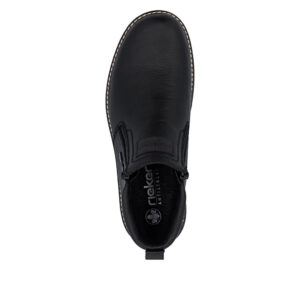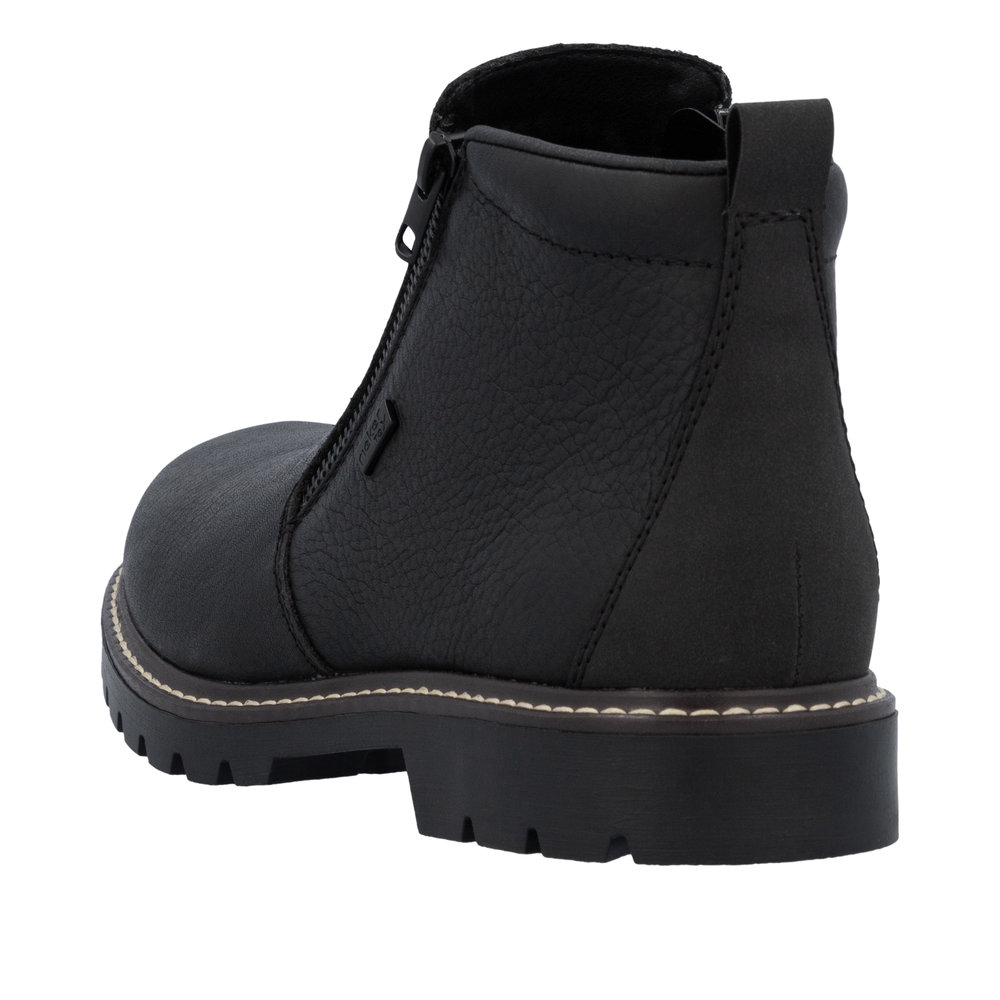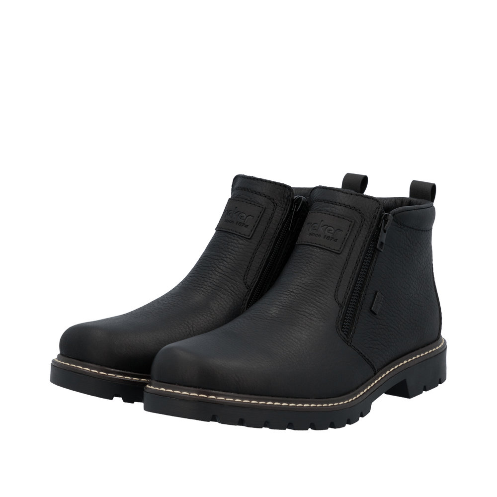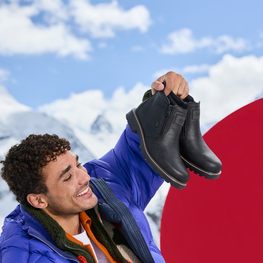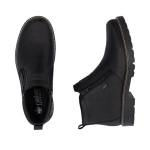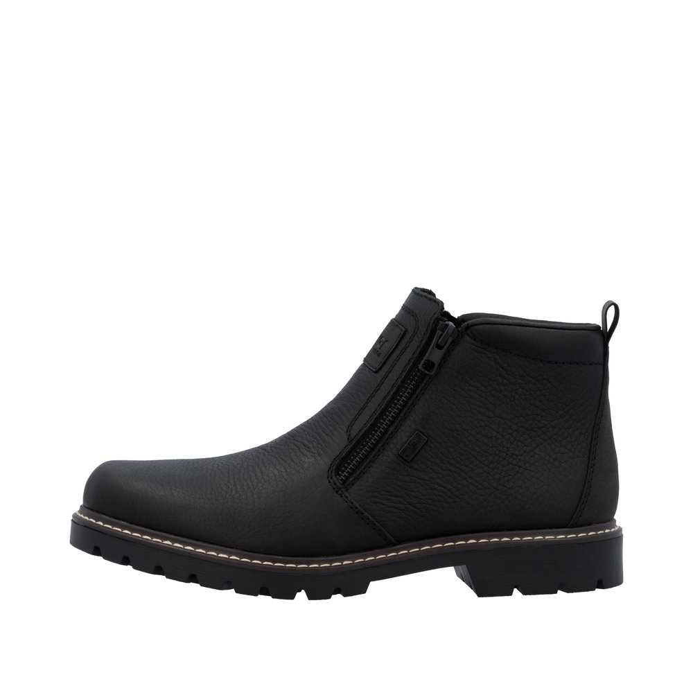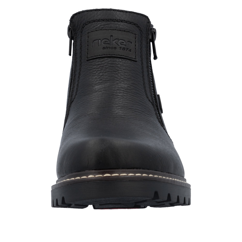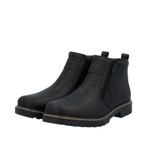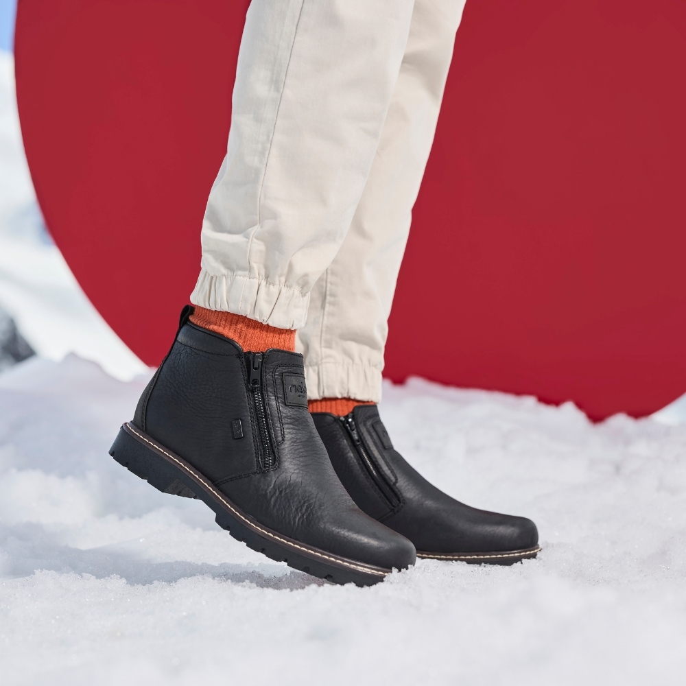 Rieker støvle til herre i sort. Denne vinterstøvle i sort kombinerer moderne udtryk med klassiske detaljer. Overdelen er fremstillet i skind, og de to lynlåse på siderne gør støvlen nem at tage på. Indvendigt finder du en blød indersål og en varm foring, som giver komfort og holder fødderne lune. Støvlen har ekstra bredde G, der giver en rummelig pasform, mens Rieker-Tex teknologien giver kraftig vandafvisning. Den solide Fiber-Grip ydersål med stødabsorbering og mønster giver både støtte og øget skridsikkerhed på glatte underlag.